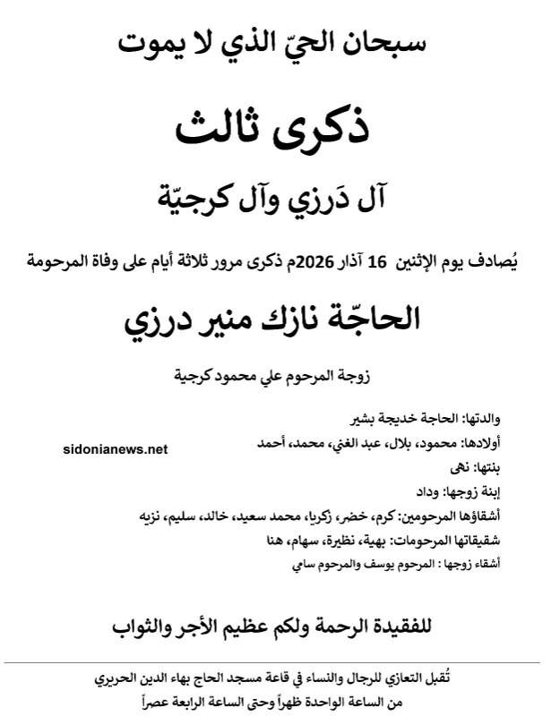 ذكرى ثالث الحاجة نازك منير درزي - 16-3-2026 آل درزي وكرجية (وفيات صيدا لبنان - جريدة صيدونيانيوز.نت)