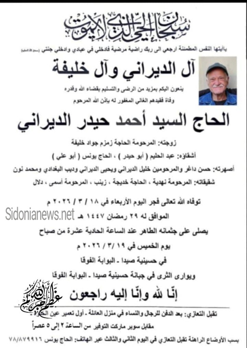 جريدة صيدونيانيوز.نت / وفاة الحاج السيد أحمد حيدر الديراني - 18-3-2026 - الدفن 19-3-2026 آل الديراني وخليفة (وفيات صيدا لبنان - جريدة صيدونيانيوز.نت)