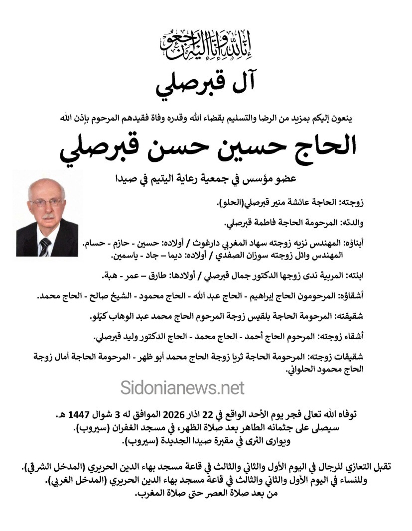 وفاة الحاج حسين حسن قبرصلي - 22-3-2026 آل قبرصلي والحلو والمغربي دارغوث والصفدي وكيلو وأبوظهر والحلواني (وفيات صيدا لبنان - جريدة صيدونيانيوز.نت )