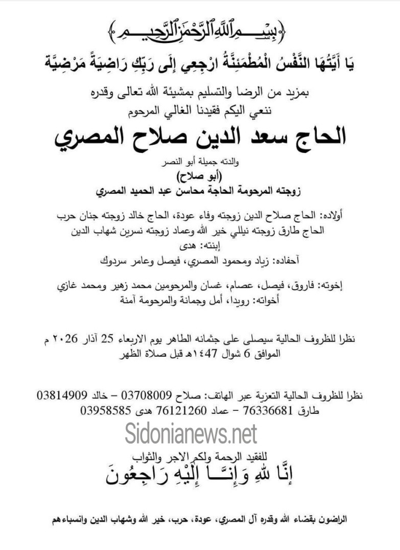 وفاة الحاج سعدالدين صلاح المصري -25-3-2026 آل المصري وعودة وحرب وخيرالله وشهاب الدين (وفيات صيدا لبنان - جريدة صيدونيانيوز.نت)