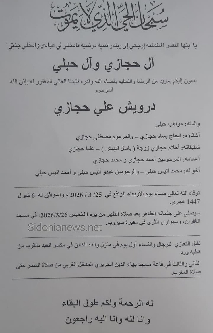 جريدة صيدونيانيوز.نت / وفاة درويش علي حجازي -26-3-2026 -آل حجازي وحبلي والهبش -(وفيات صيدا لبنان -جريدة صيدونيانيوز.نت) 2026-03-26 Sidonianews net ------- وفاة درويش علي حجازي -26-3-2026 -آل حجازي وحبلي والهبش -(وفيات صيدا لبنان -جريدة صيدونيانيوز.نت) 2026-03-26