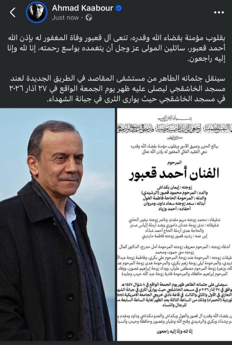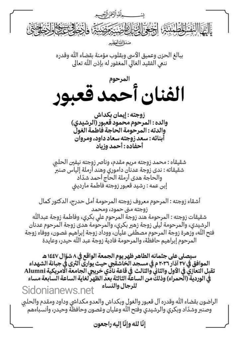 وفاة الفنان اللبناني أحمد محمود قعبور صاحب رائعة أناديكم: الدفن 27-3-2026 آل قعبور والغول وبكداشي ومقدم والحلبي وصنبر وشداد وبكري والرشيدي وفتح الله وعليان وغصون وحافظة وحيدر - وفيات لبنان - جريدة صيدونيانيوز.نت