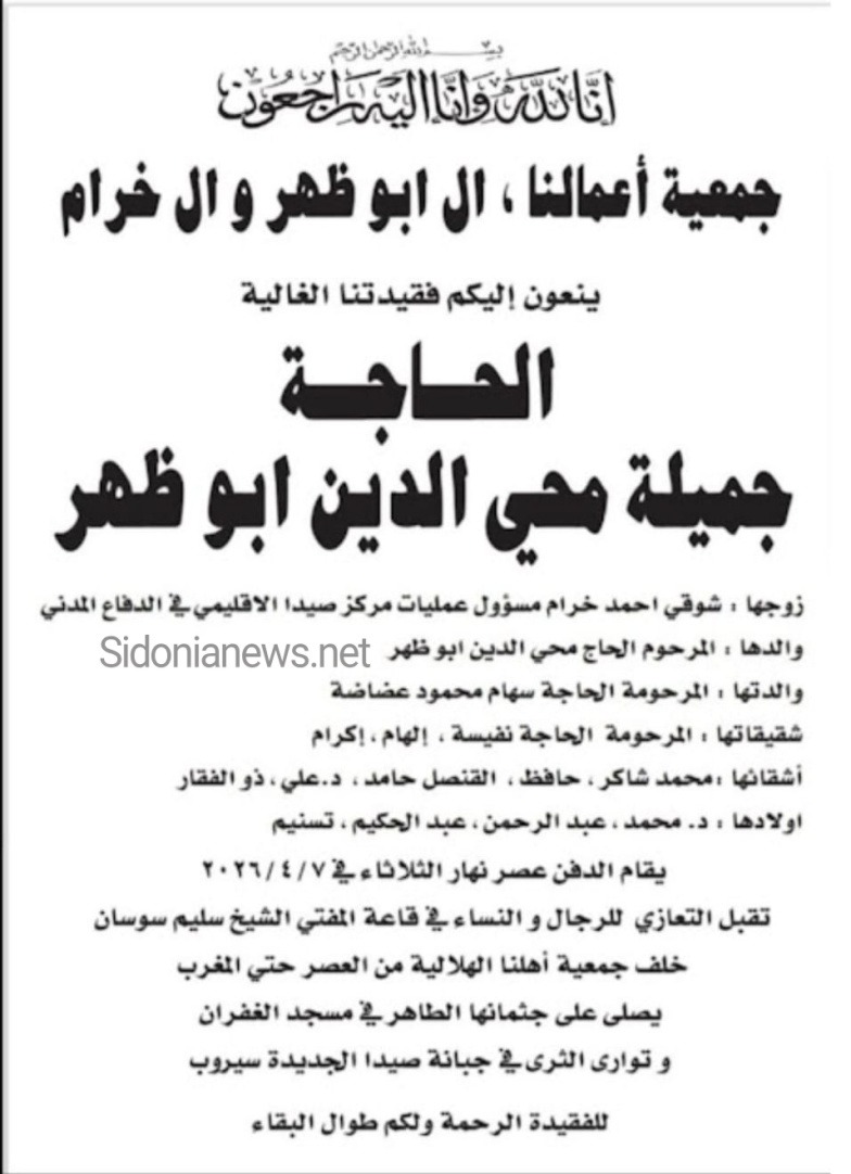 أسرة جريدة صيدونيانيوز.نت تتقدم من عائلة الفقيدة بخالص التعزية بوفاة المرحومة جميلة محي الدين أبوظهر وتسأل الله عز وجل لها الرحمة والمغفرة وأن يسكنها فسيح جناته وأن يلهم عائلتها الصبر والسلوان وإنا لله وإنا إليه راجعون