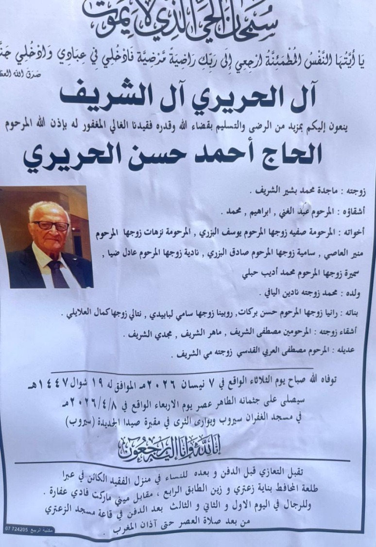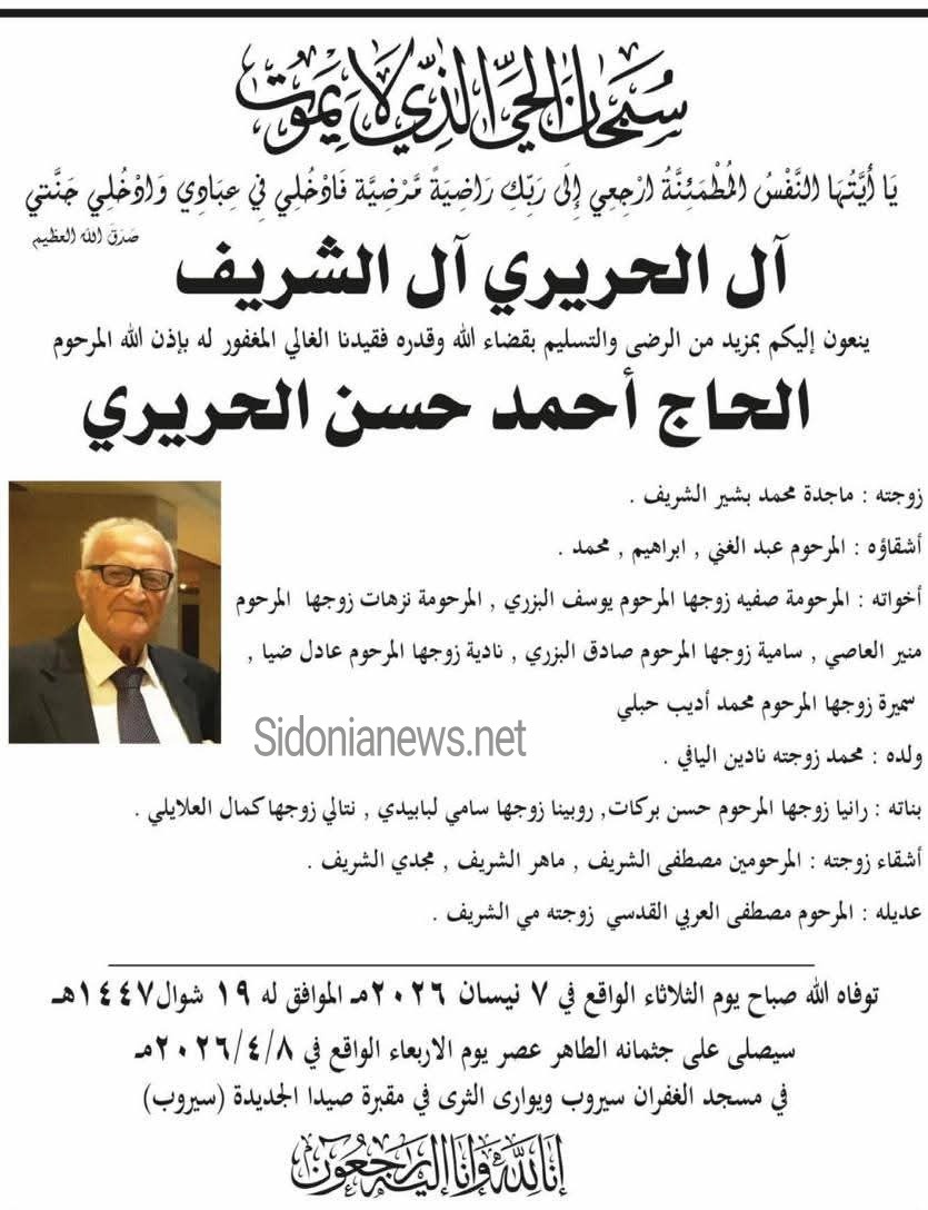 وفاة الحاج أحمد حسن الحريري - 8-4-2026 آل الحريري والشريف والبزري والعاصي وضيا وحبلي واليافي وبركات ولبابيدي والعلايلي والعربي القدسي (وفيات صيدا لبنان - جريدة صيدونيانيوز.نت)