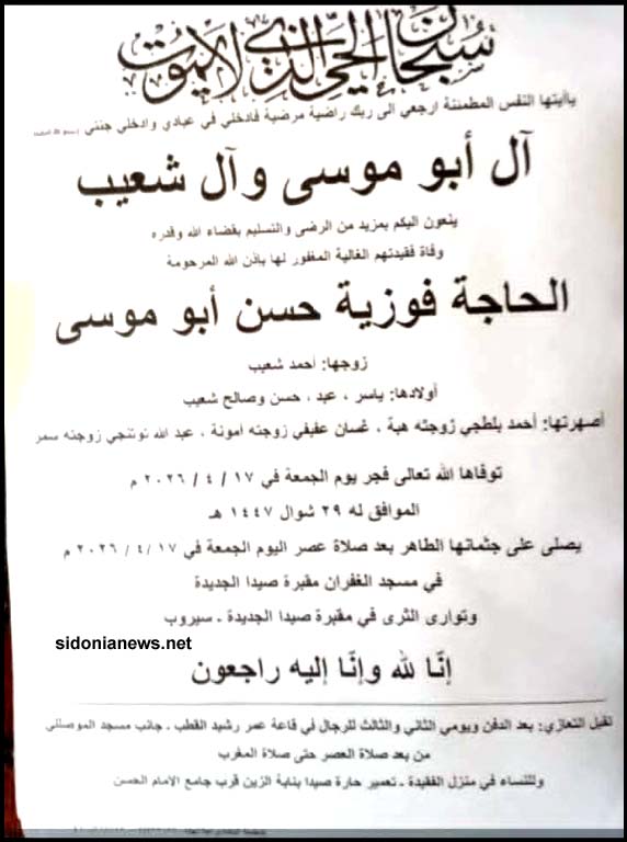 وفاة الحاجة فوزيه حسن أبو موسى 17-4-2026 آل موسى وشعيب وبلطجي وبتكجي وعفيفي (وفيات صيدا – لبنان – جريدة صيدونيانيوز.نت )