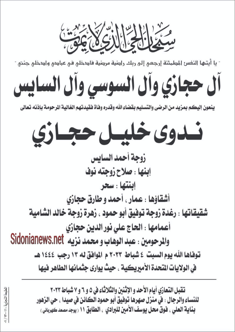 جريدة صيدونيانيوز.نت / ندوى خليل حجازي -التعازي في صيدا من 5-2-2023 آل حجازي والسوسي والسايس (وفيات صيدا لبنان - جريدة صيدونيانيوز.نت )